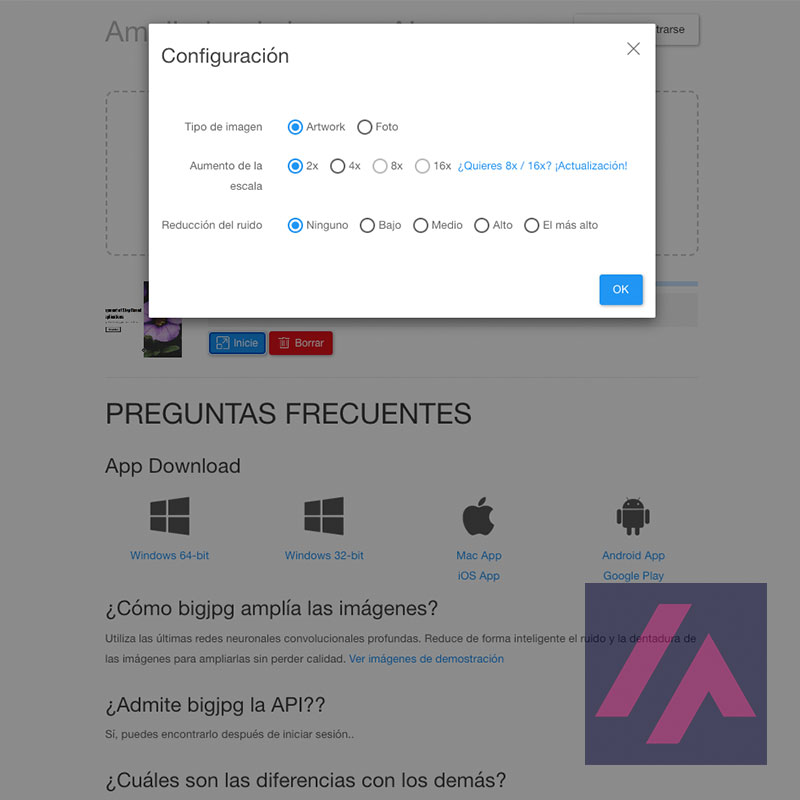 Bigjpg es una herramienta que utiliza redes neuronales profundas para ampliar imágenes sin afectar su calidad. Reduciendo inteligentemente el ruido y la distorsión de las imágenes. Este servicio tiene una API disponible para su uso, y se destaca por su capacidad de mantener la calidad en las imágenes ampliadas comparado con otros programas como Photoshop. Es especialmente eficiente en imágenes de anime, ya que mantiene los colores, detalles y bordes. También es compatible con fotografías normales.